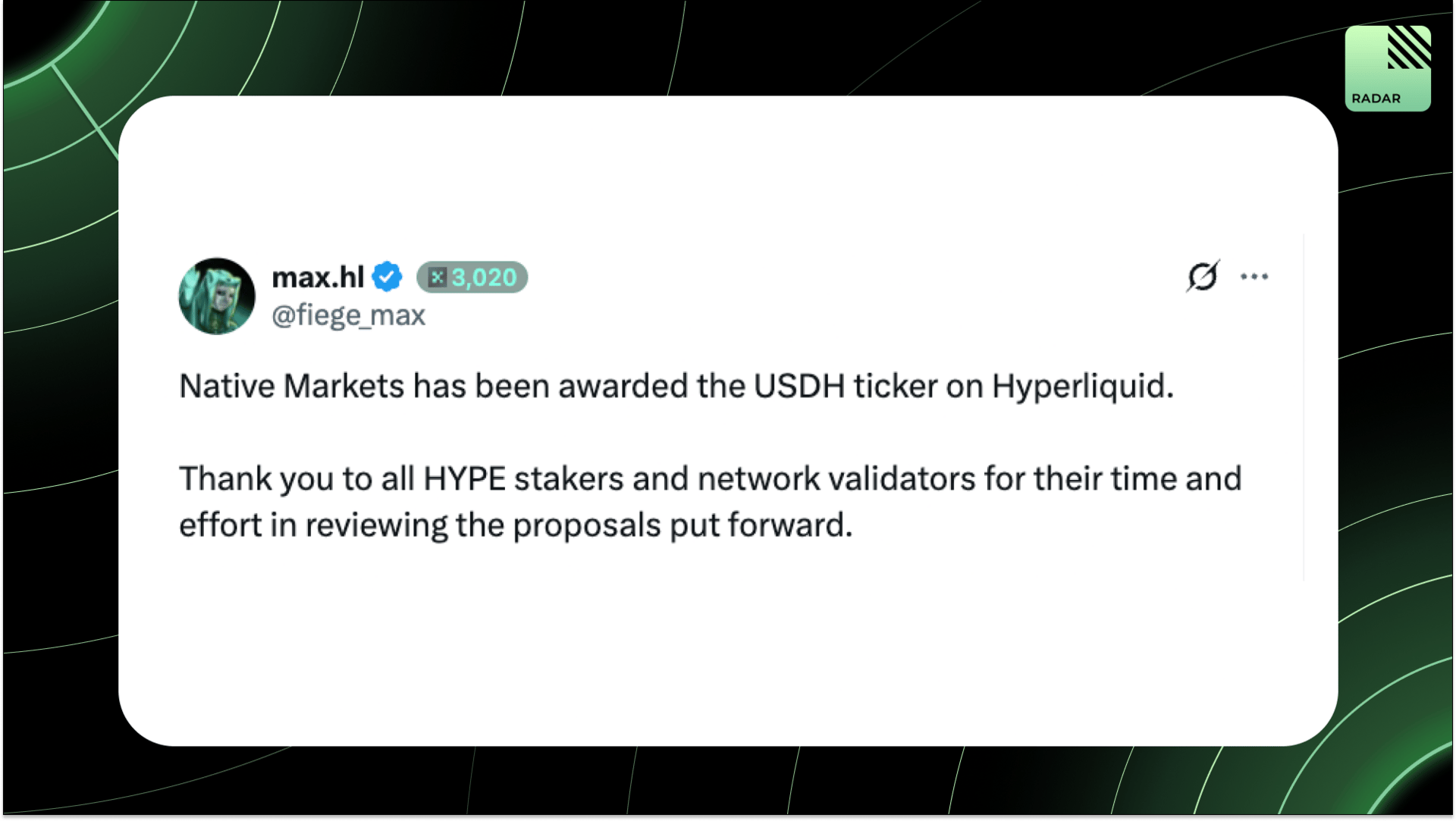 Native Markets won the USDH ticker on Hyperliquid, with thanks to HYPE stakers and validators. Deployment of USDH HIP-1 and ERC-20 starts within days, beginning with capped test mints/redeems before opening the USDH/USDC order book and enabling uncapped flows.