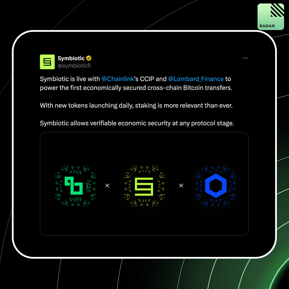 Symbiotic, Chainlink, and Lombard just shipped the first cross-chain transfer solution backed by restaked collateral. LBTC transfers via CCIP now come with automated monitoring powered by $100M LINK and 20M BARD vaults, turning restaking into real economic security for Bitcoin DeFi.