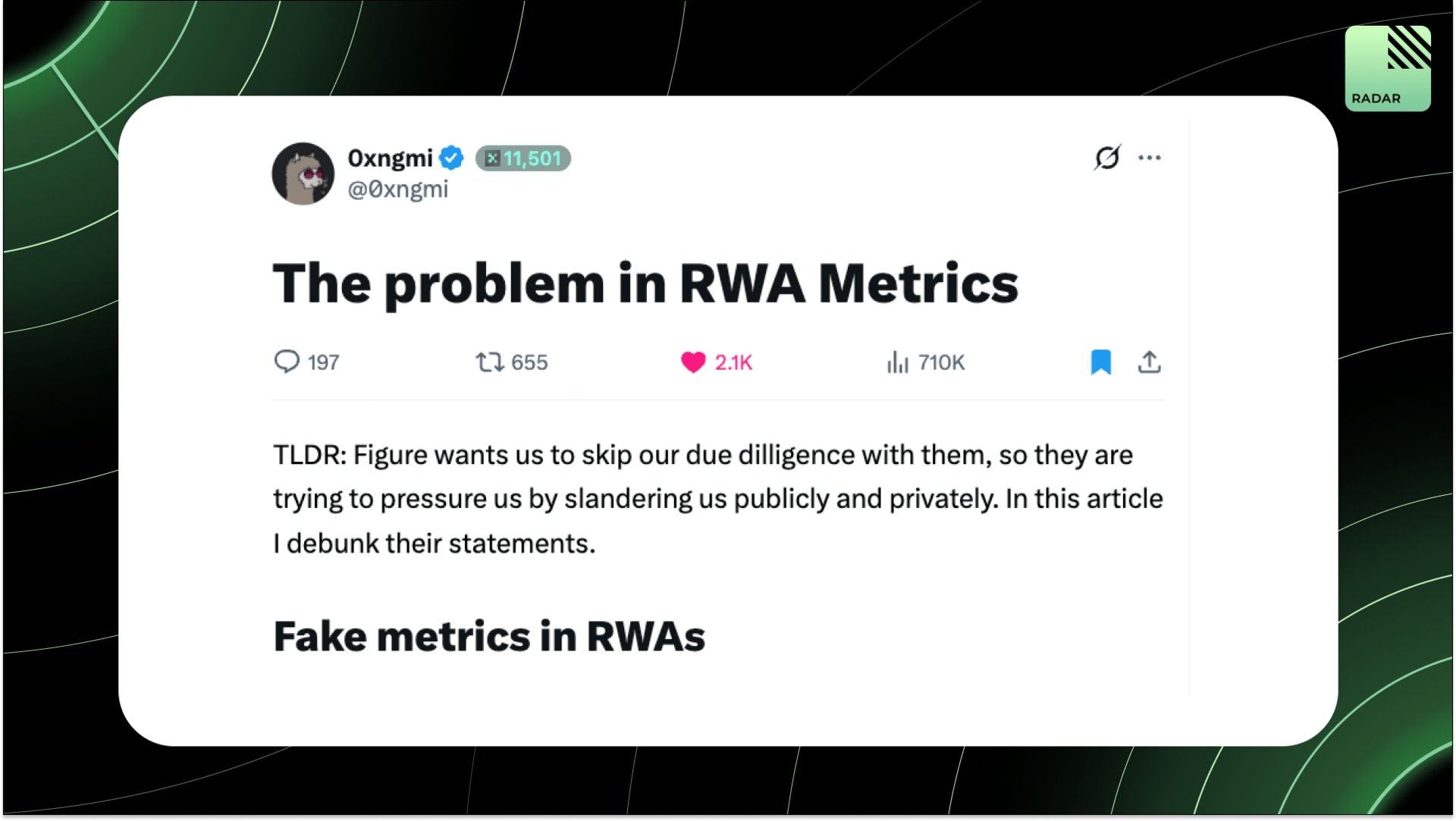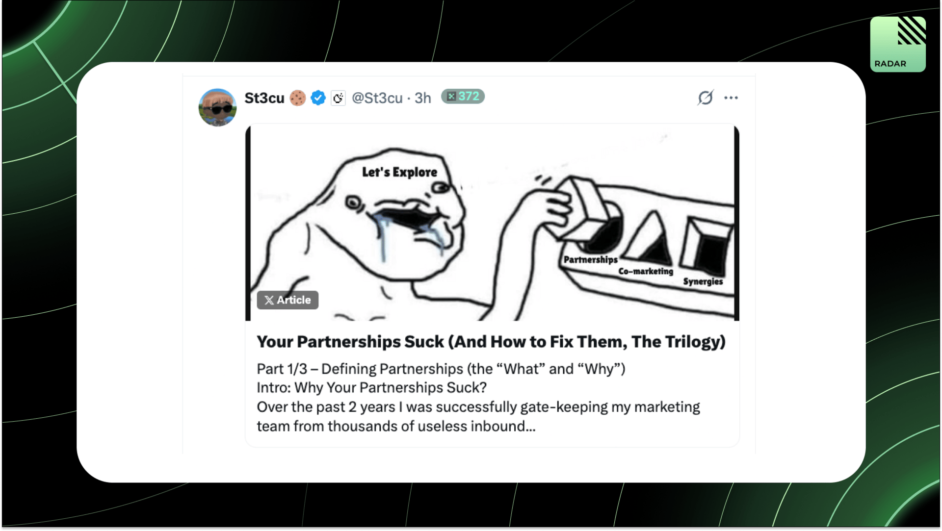 Quick Intro: Radarblock is a Web3-native growth agency that increases awareness, TVL, volume, and social metrics for its clients over a consistent time frame without uncertainty and confusion. All tweets are hyperlinked, so click to pull them up on Twitter!