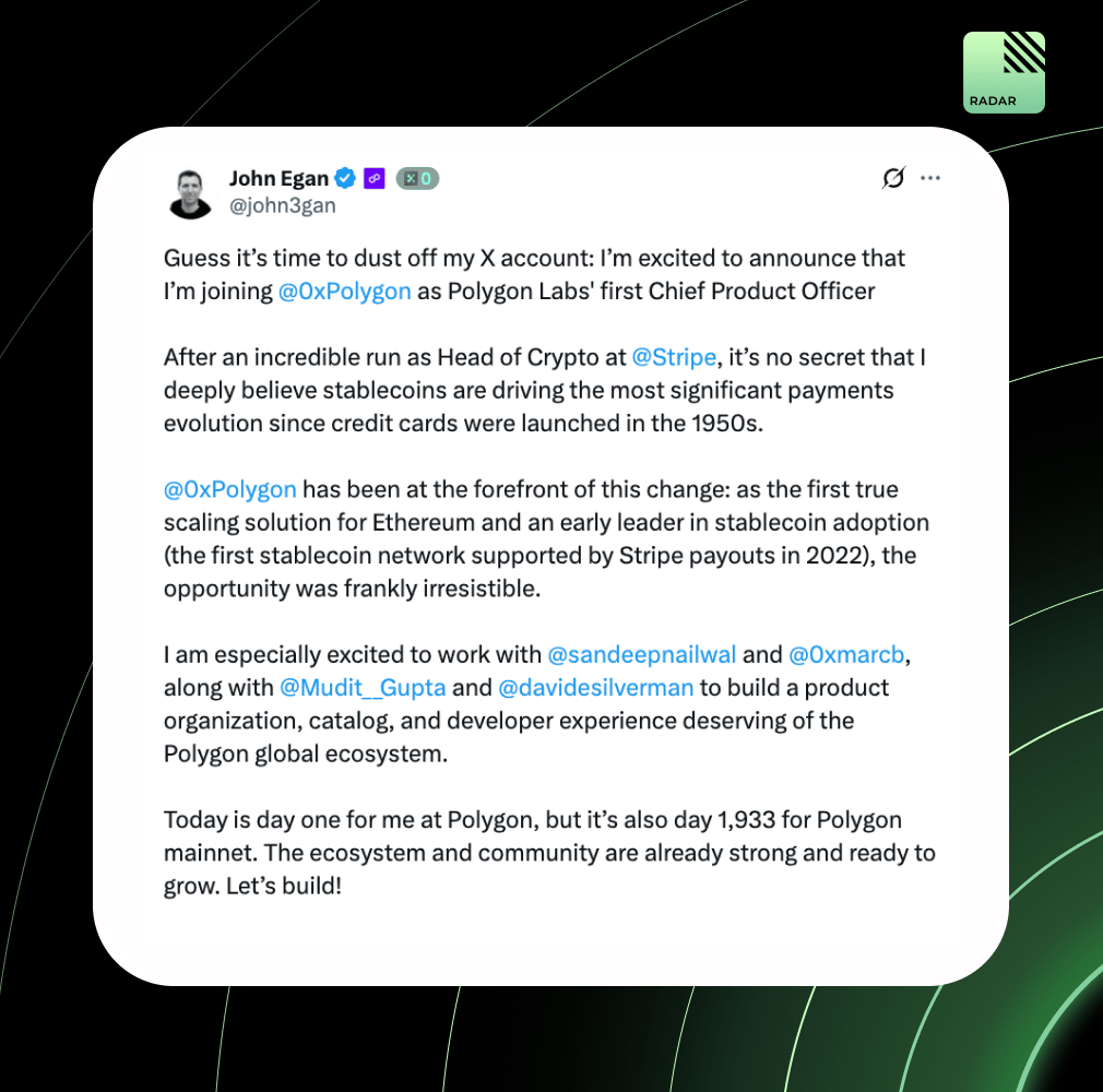 John Egan, ex-Stripe Head of Crypto, is now Polygon Labs’ first Chief Product Officer. He cites stablecoins as the biggest payments shift since credit cards and calls Polygon’s scaling and early stablecoin leadership “irresistible.” He’ll focus on product org, catalog, and dev experience.