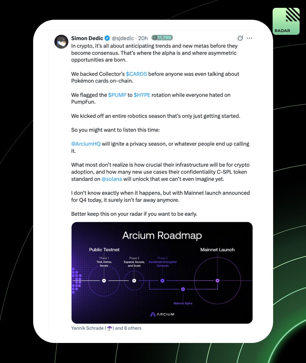 Simon Dedic frames Arcium as the next big meta. After calling CARDS, Pump to HYPE, and robotics, he argues Arcium’s confidential Solana standard (C-SPL) could trigger a “privacy season.” With mainnet set for Q4, he sees its infrastructure unlocking new use cases and asymmetric opportunities.
