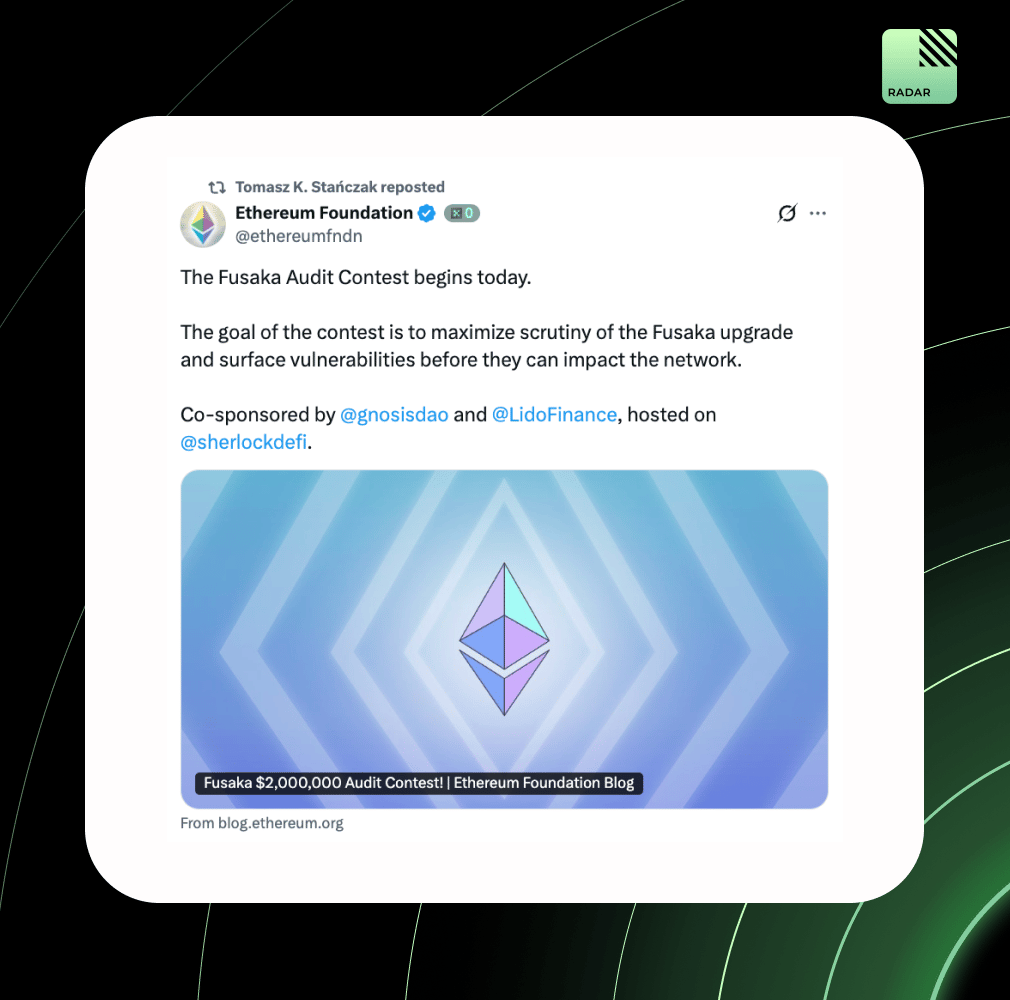 The Ethereum Foundation just kicked off the Fusaka $2M audit contest with Sherlock, backed by Gnosis and Lido. Findings in week one earn 2x rewards. The four-week contest aims to stress-test Fusaka before launch, reinforcing that protocol security is an ecosystem responsibility, not EF alone.
