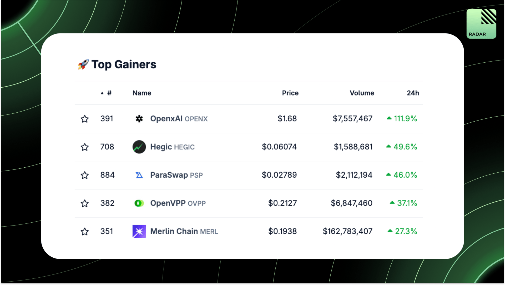 Top Gainers: OPENX, HEGIC, PSP, OVPP, MERL.