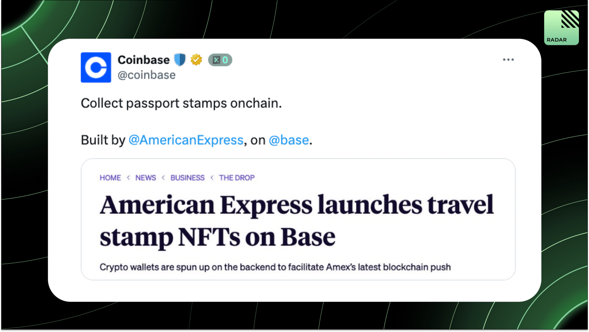Amex just dropped onchain travel “stamps” on Base: ERC-721 NFTs minted behind the scenes when cardholders use their Amex abroad. Wallets are abstracted, stamps can’t be traded, and are meant more as digital keepsakes than a crypto onramp. Another quiet step in Amex–Coinbase’s premium web3 play.