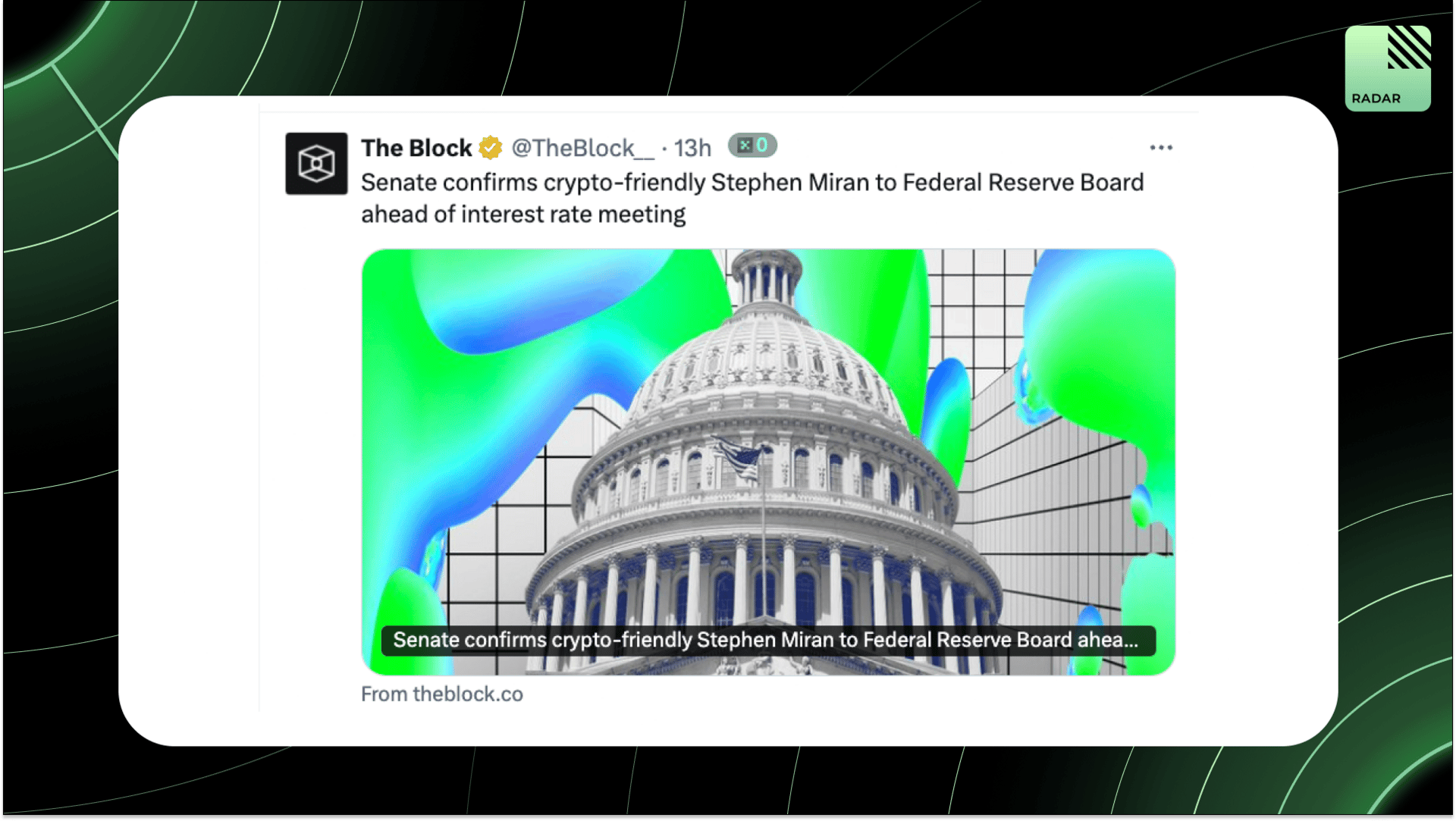 The Senate narrowly confirmed Stephen Miran, a crypto-friendly former Hudson Bay strategist, to the Federal Reserve Board in a 48–47 vote. Miran, who has called for streamlined crypto rules, will serve until Jan 2026, joining ahead of the Fed’s upcoming rate-setting meeting.