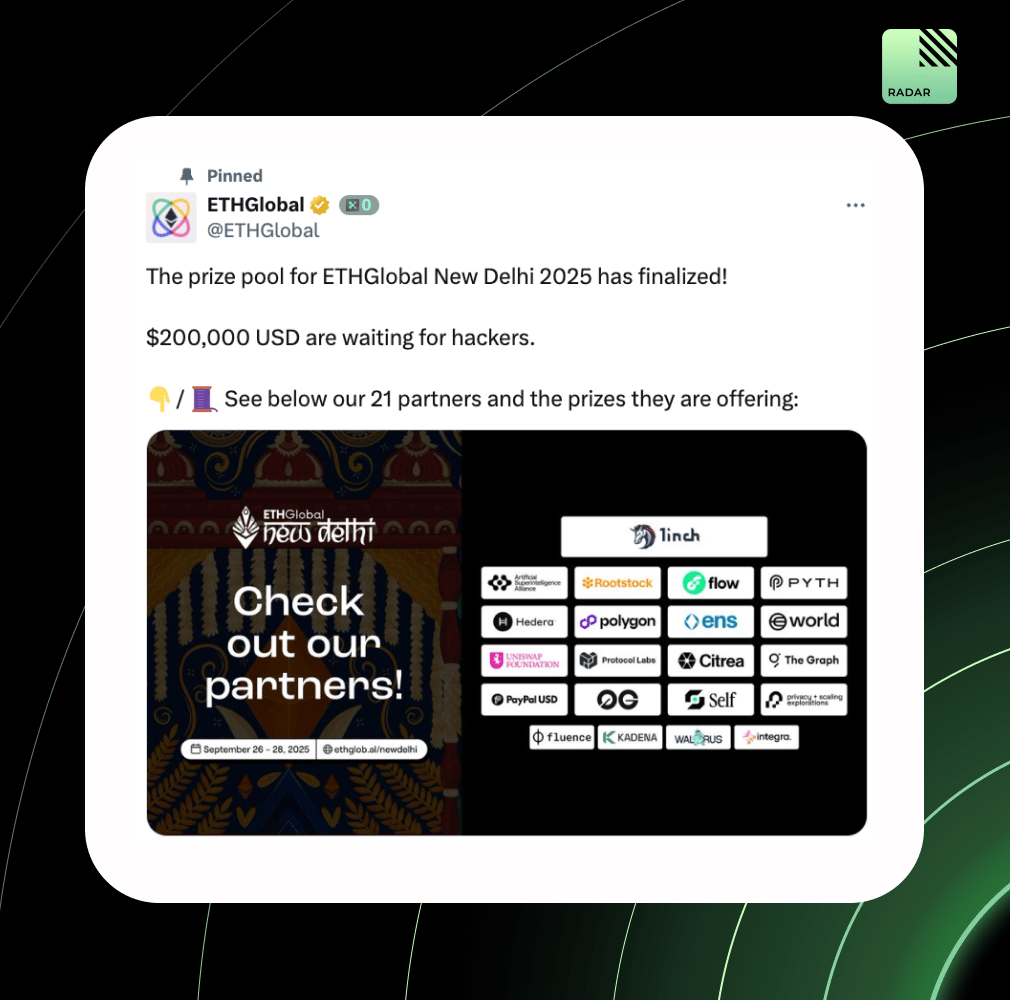 ETHGlobal New Delhi 2025 locks in a $200K prize pool across 21 partners. Backers include 1inch, Rootstock, Flow, Pyth, Hedera, Polygon, ENS, and more. Hackers will compete to build DeFi, infra, and consumer crypto projects at scale under Ethereum’s ecosystem.