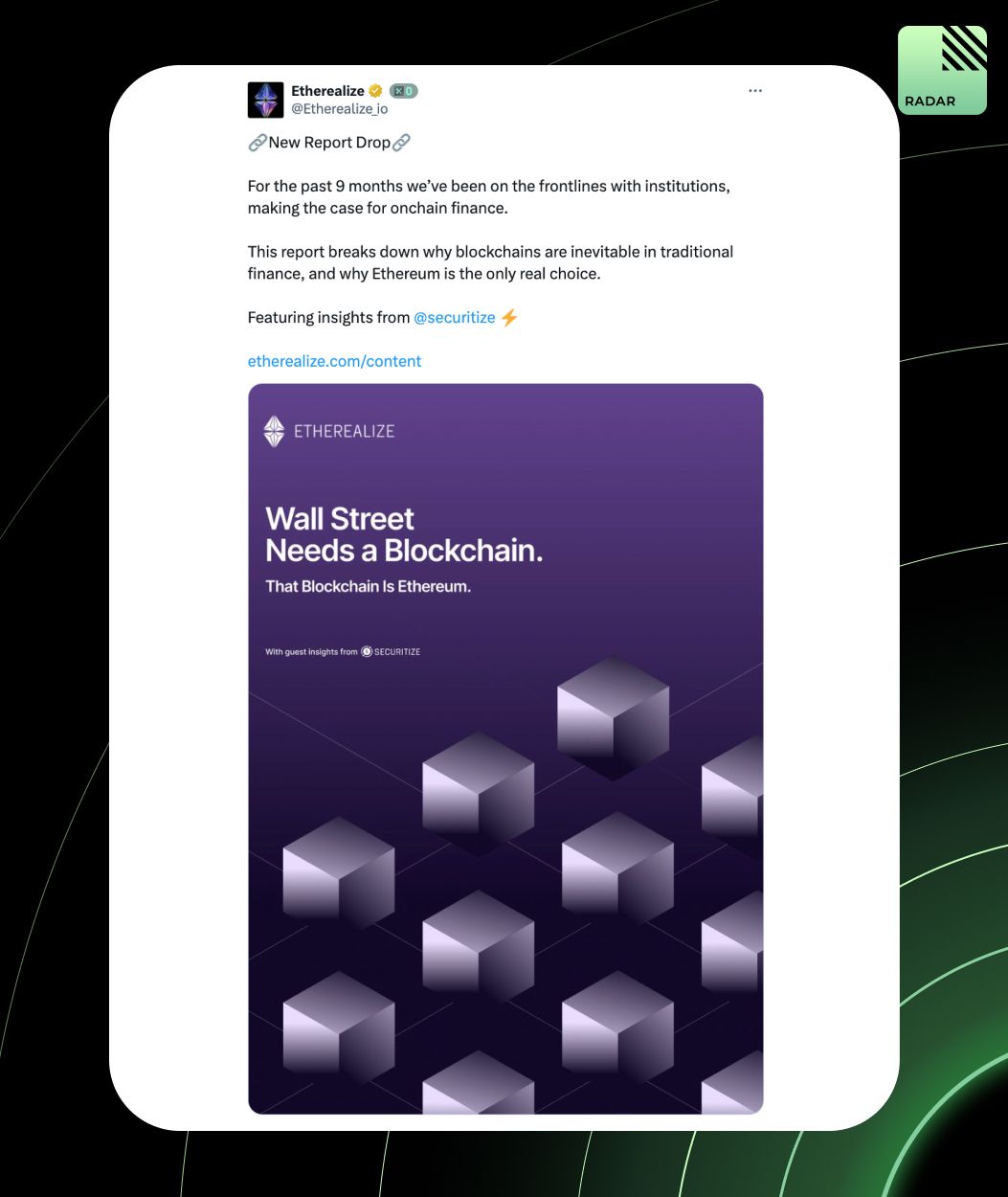 Etherealize spent 9 months with institutions and released a report arguing that on-chain finance is inevitable, and Ethereum is the only viable base. Backed by insights from Securitize, it frames Ethereum as TradFi’s settlement layer of choice.