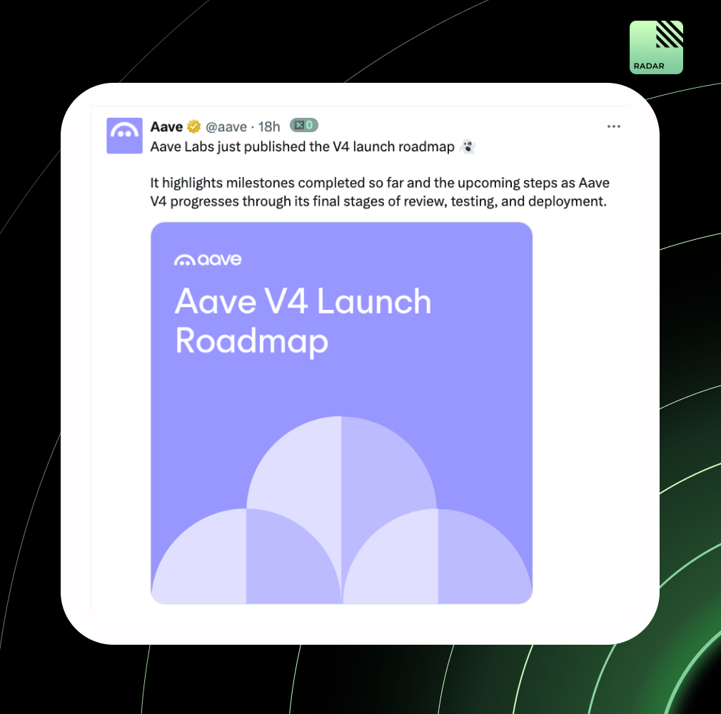 Aave just locked in its V4 launch roadmap, aiming for Q4 2025. The rollout stacks formal verification, layered audits, and researcher reviews, plus a new interface for testnet trials. TokenLogic and ACI will handle GTM to drive adoption, manage V3 migration, and stabilize post-launch growth.