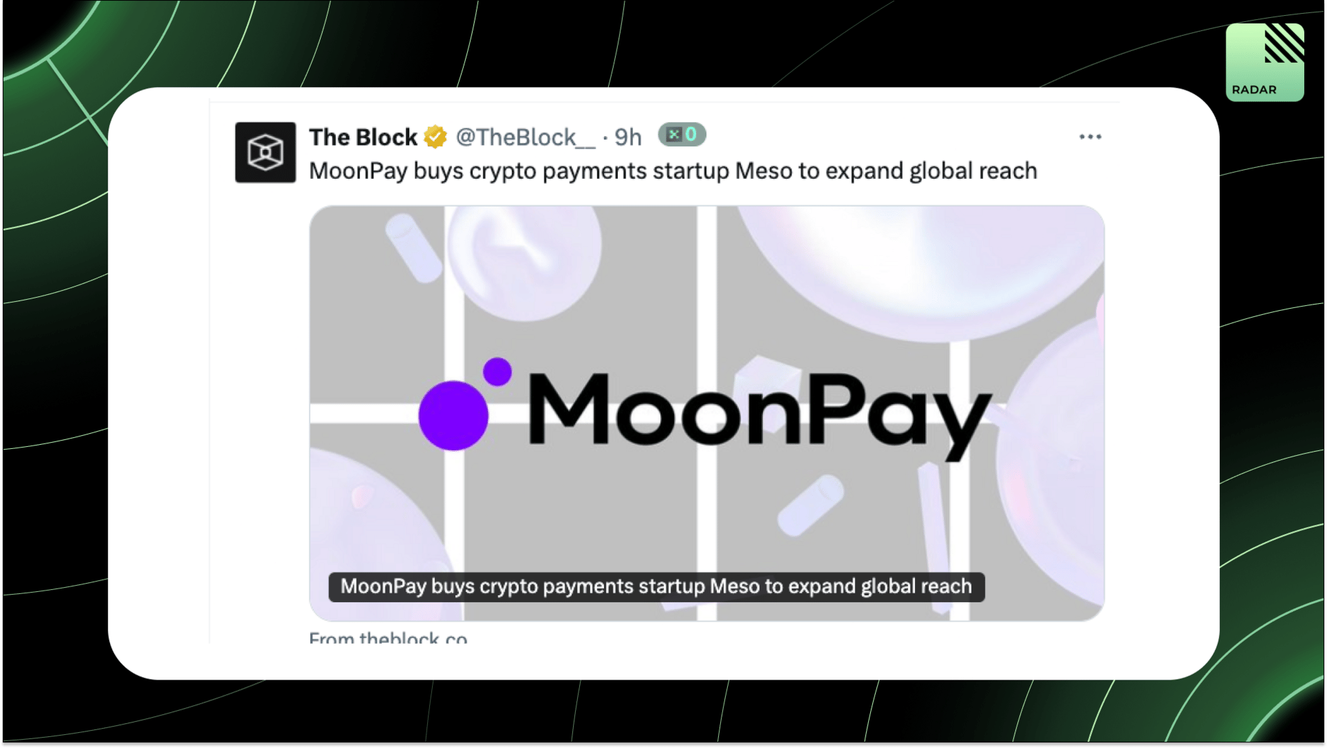 MoonPay acquired payments startup Meso to expand its global network linking banks, cards, stablecoins, and blockchains under U.S. and EU rules. Meso’s founders join as CTO and SVP of Product. This is MoonPay’s fourth acquisition in a year as it scales beyond onramps into global payments.