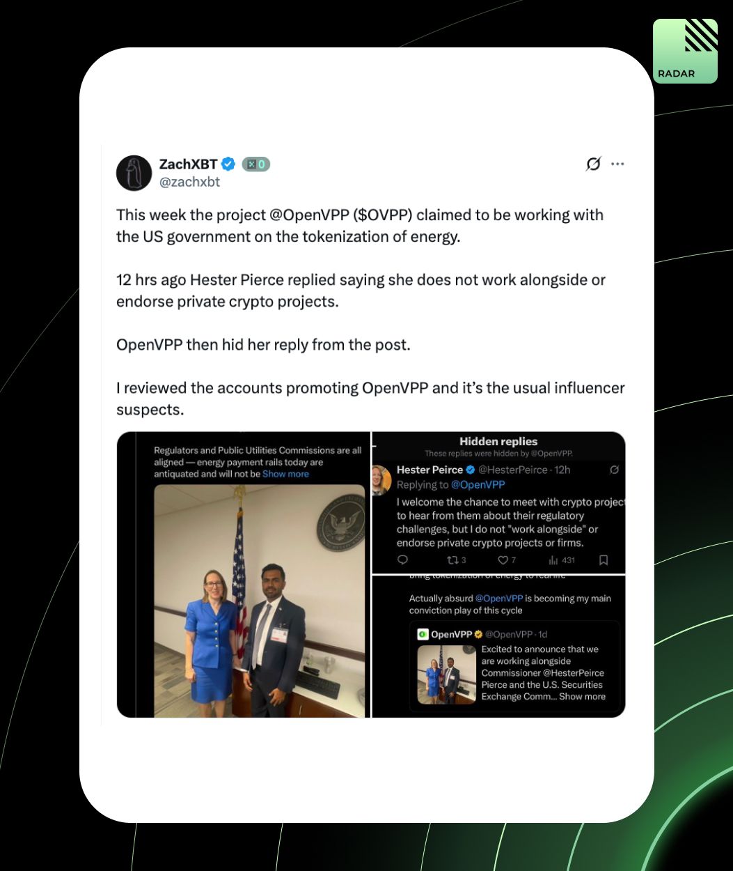This week, Open VPP (OVPP) claimed they were “working alongside” the SEC on energy tokenization. 12 hours later, SEC Commissioner Hester Peirce clarified she does not endorse or work with private crypto projects. Open VPP then hid her reply before blaming an “intern.” The promo push is coming from the usual influencer circle.