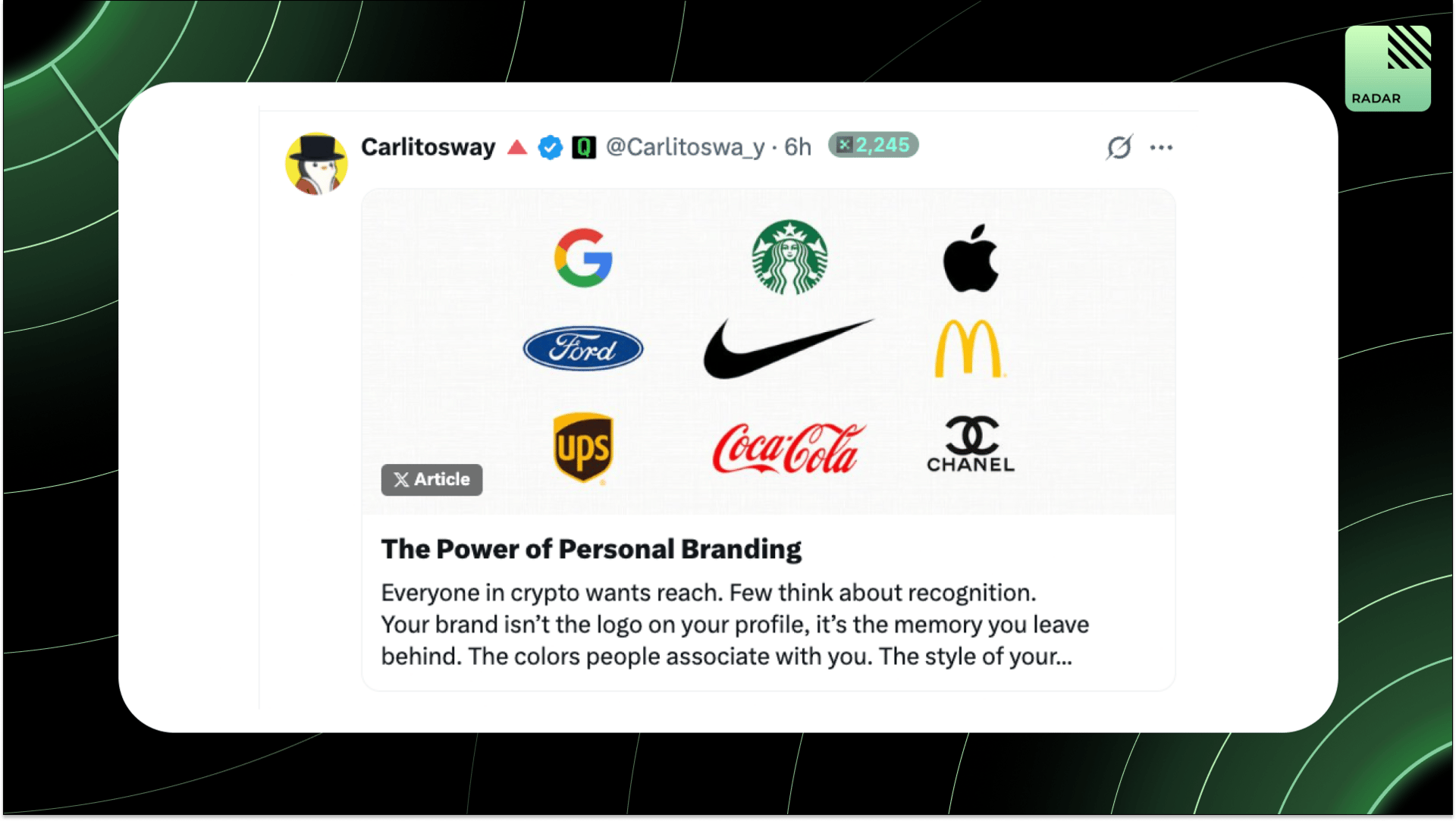 Personal branding in crypto is about recognition. Lock in a PFP, colors, and visuals that people associate with you. Layer in consistency, human touch, and storytelling. Recognition and trust are the moat and signal in a sea of noise.