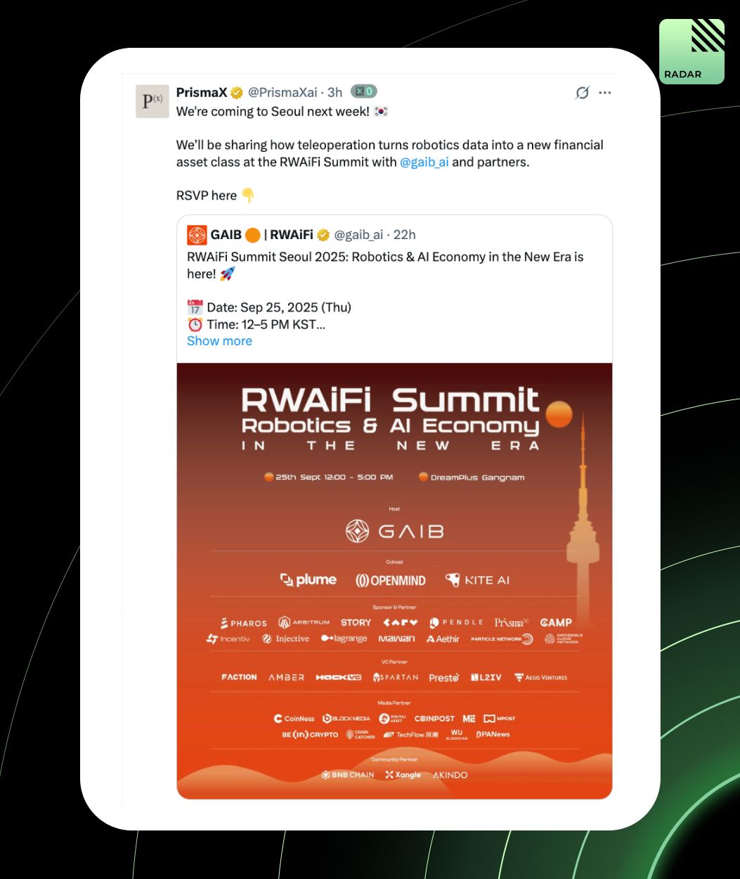 PrismaX is heading to Seoul next week for the RWAiFi Summit with GAIB. They’ll be diving into how teleoperation turns robotics data into a financial asset class.