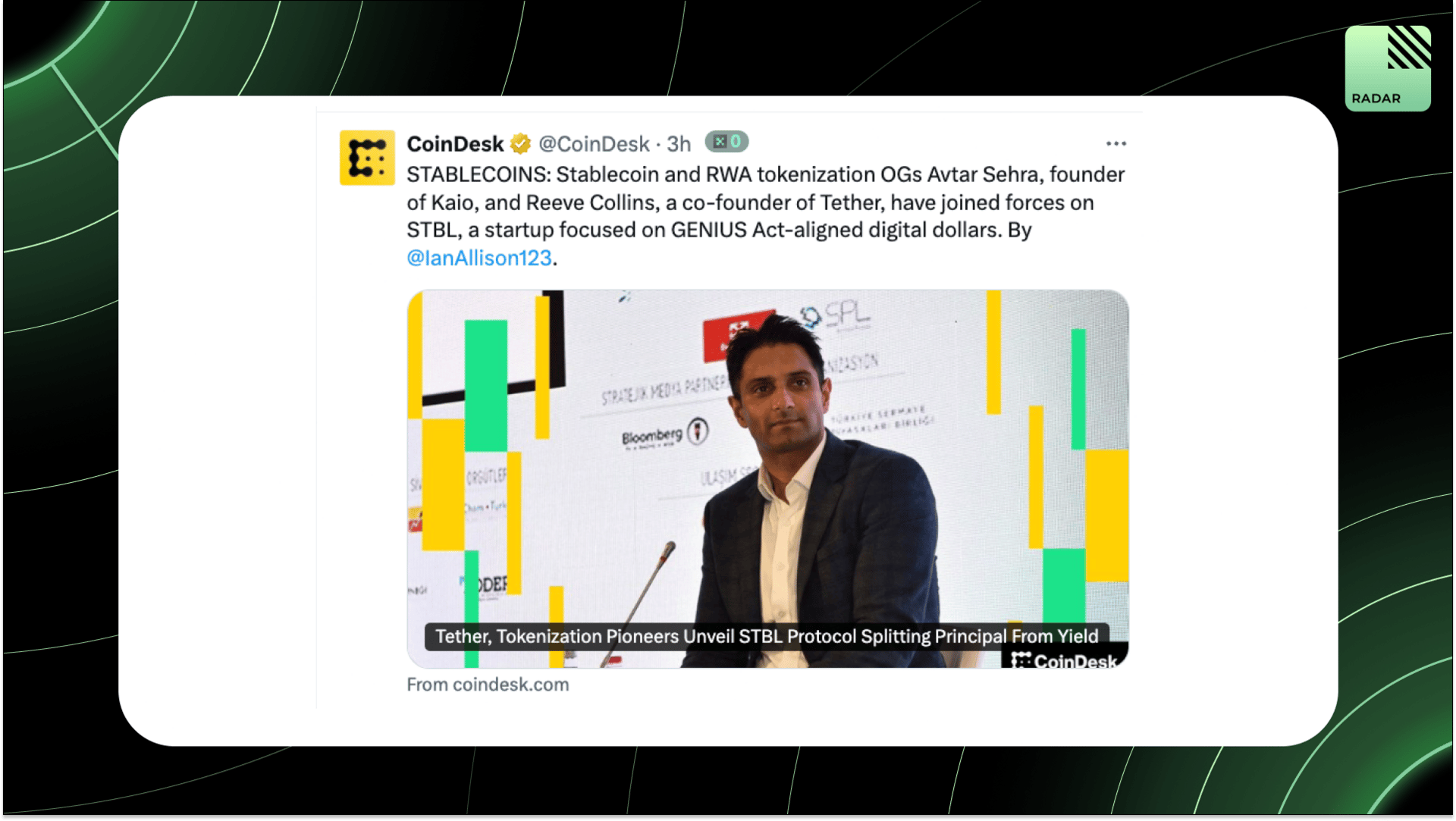 STBL, cofounded by Tether’s Reeve Collins and Avtar Sehra, lets users lock tokenized RWAs like BENJI or BUIDL, splitting them into a dollar-pegged stablecoin (USST) and a yield NFT (YLD). Minters keep the yield, not issuers, pushing “Stablecoin 2.0” aligned with the GENIUS Act.