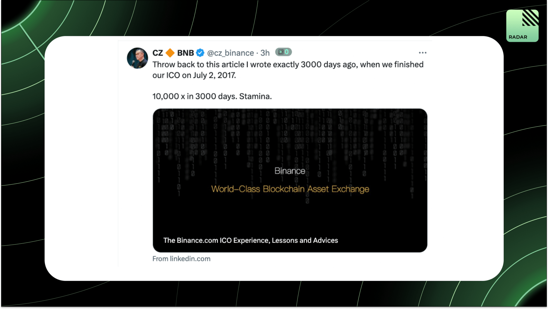 BNB crossed $1,000. CZ marked the moment by resurfacing his article written exactly 3,000 days ago, right after Binance’s ICO in 2017. From raising $15M and 20k seed users in 16 days to a 10,000x run, a story of speed, stamina, and relentless execution.