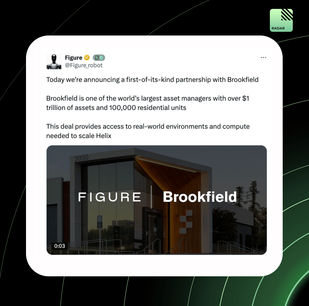 Figure partners with Brookfield ($1T AUM, 100k residential units) to scale Helix, its humanoid AI model. The deal unlocks real-world environments for data capture, compute for training, and pathways for robot deployment across Brookfield’s portfolio.