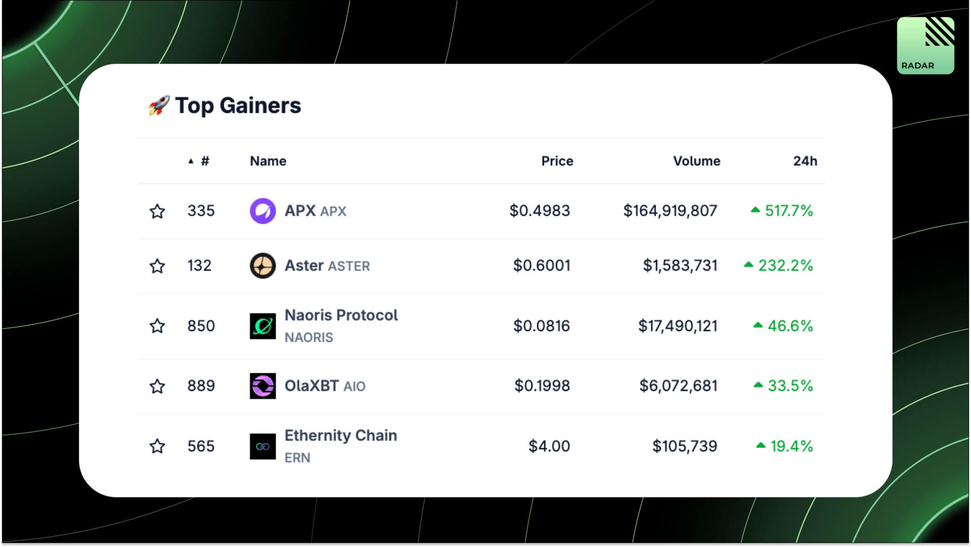 Top Gainers: APX, ASTER, NAORIS, AIO, ERN.