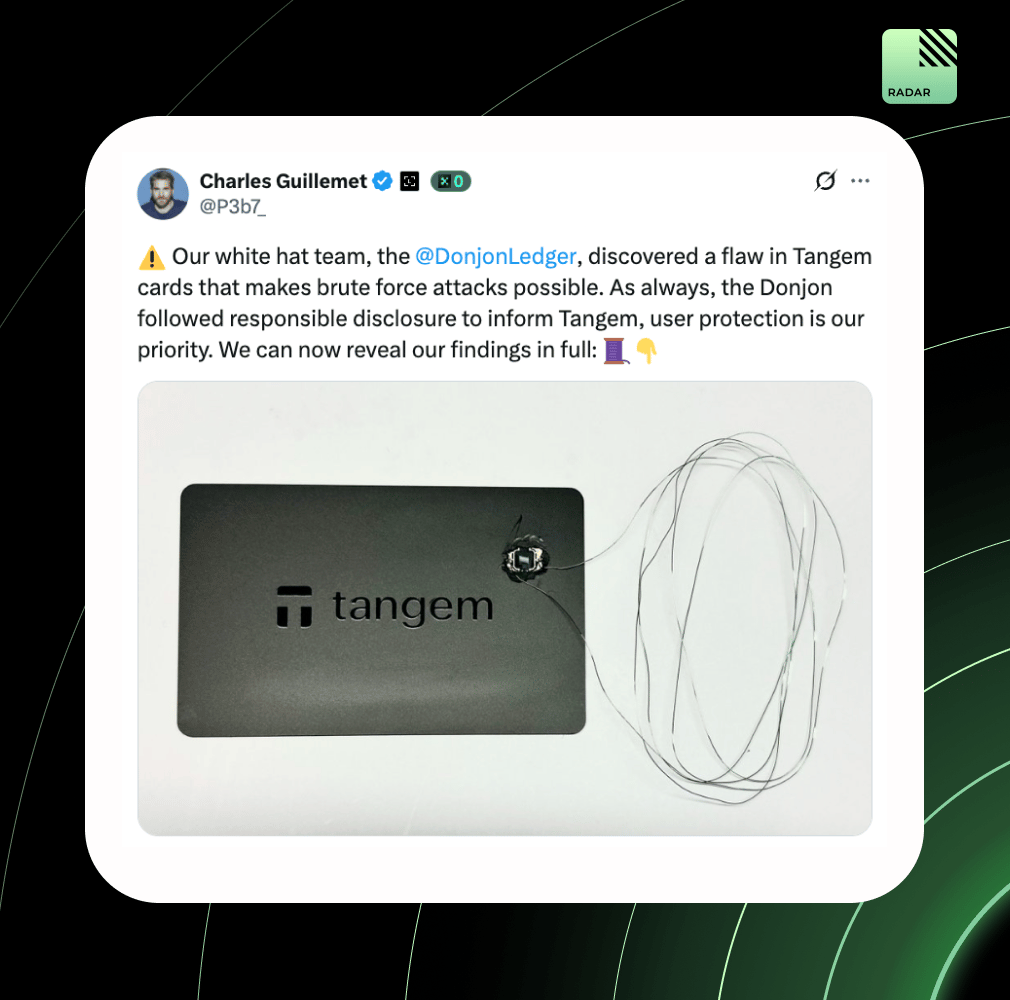 Ledger’s CTO found Tangem cards vulnerable to “tearing attacks” that bypass security delays, letting attackers brute-force PINs. A 4-digit PIN could be cracked in ~1h. Since cards can’t be updated, users are urged to set long, complex passwords.
