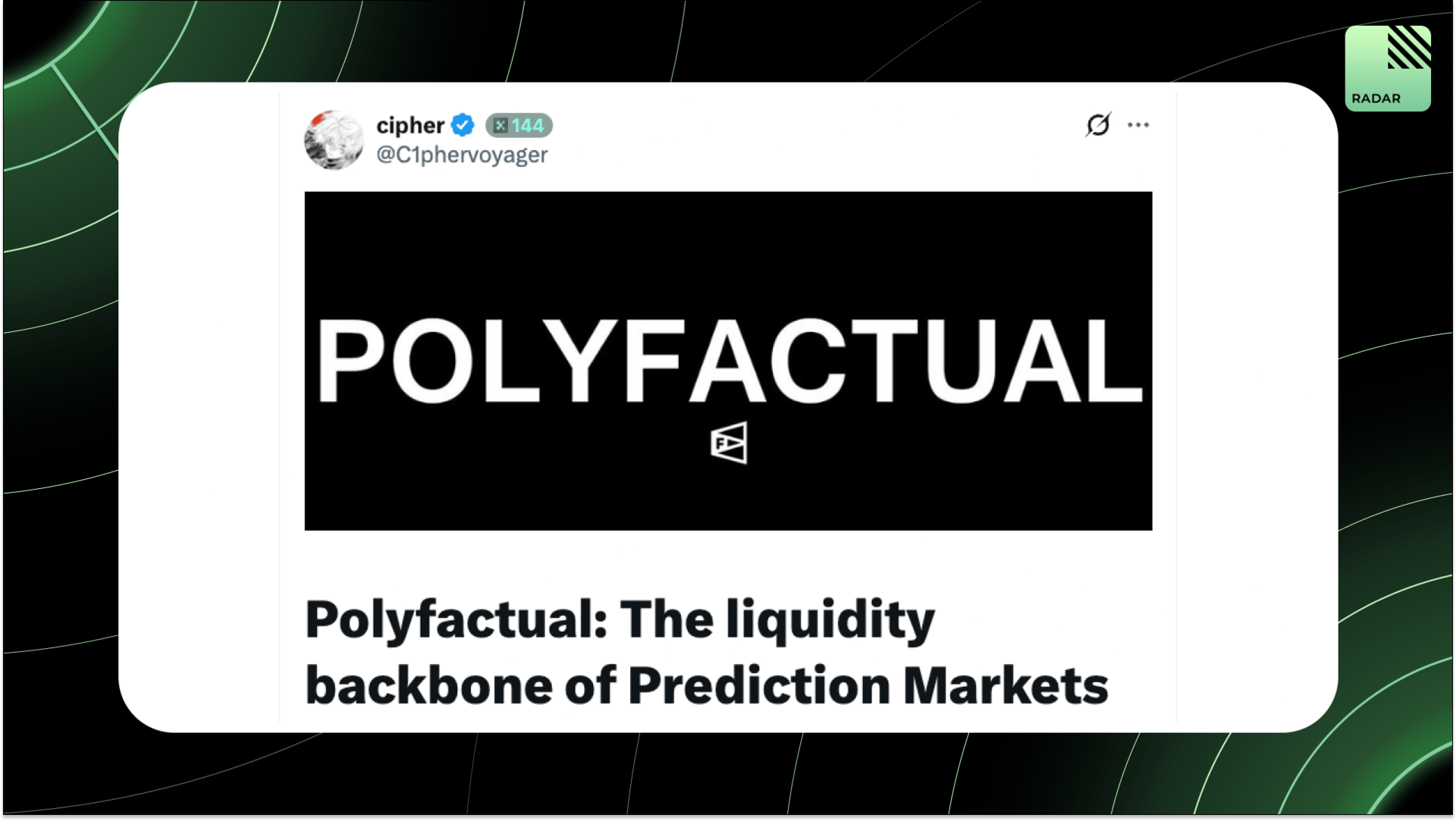 Polyfactual is building the liquidity rails for prediction markets with FactLayer (event-linked insurance), Project Y (cross-venue arbitrage), and daily pump.fun streams (~$230K fees). At ~$4M mcap, POLYFACTS is a levered bet on the infrastructure monetizing PM growth.
