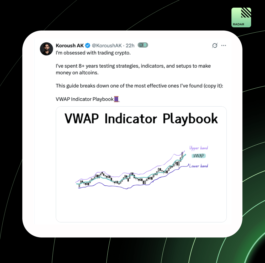 Koroush AK shares a VWAP trading playbook after 8+ years in crypto. VWAP filters noise by weighting price with volume, showing true market value. He explains slope and band signals for trends vs. chop, plus TradingView settings. A full PDF guide is included for altcoin setups.