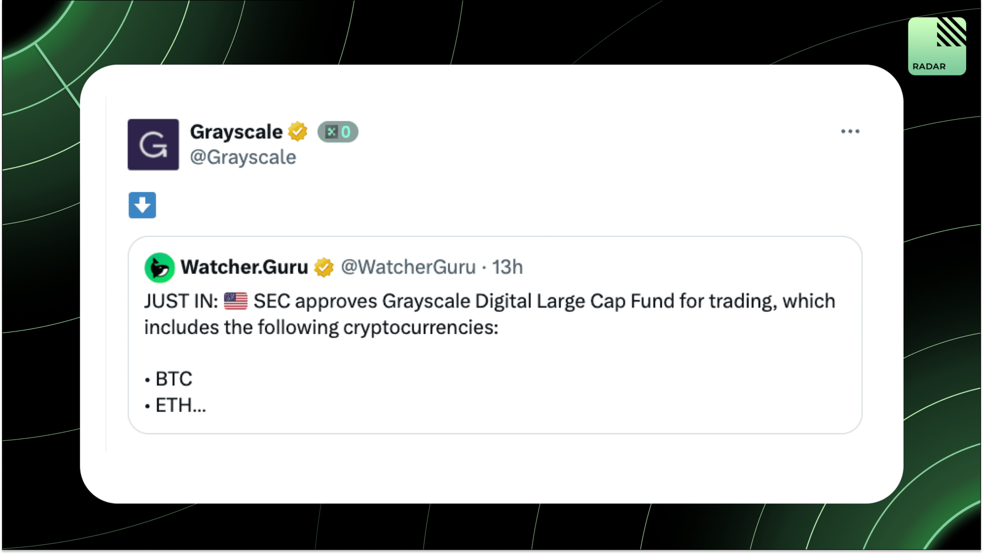 SEC cleared Grayscale’s Digital Large Cap Fund (GDLC) for trading, giving investors regulated exposure to BTC, ETH, XRP, SOL, and ADA. Another nod toward mainstreaming diversified crypto baskets inside U.S. capital markets.