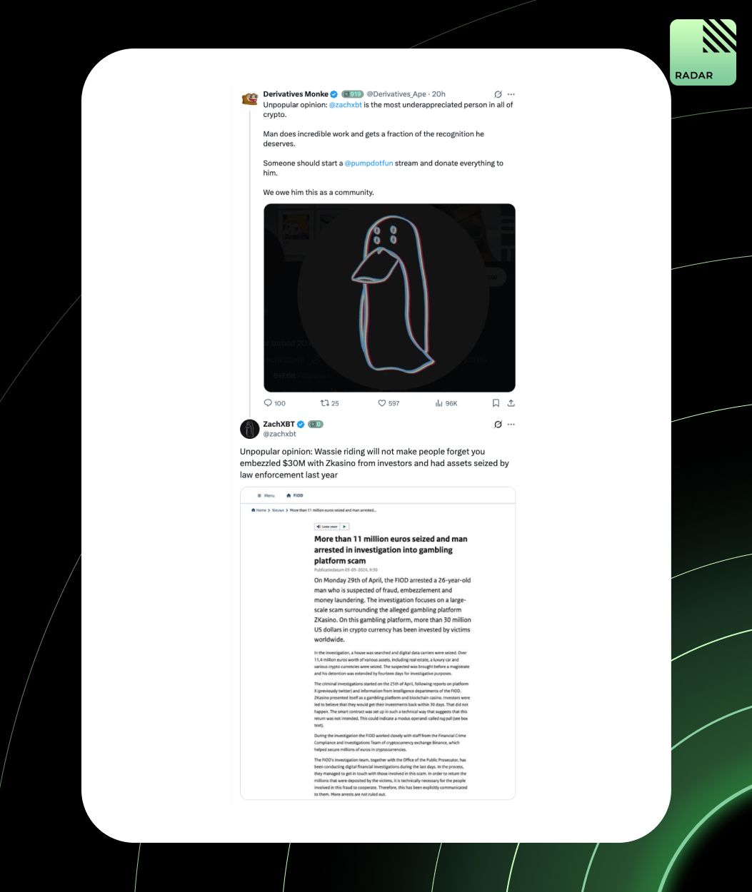 Derivatives Monke called ZachXBT the most underappreciated figure in crypto, suggesting a PumpFun stream to support him. ZachXBT shot back, reminding Monke of the $30M Zkasino embezzlement case and seized assets.
