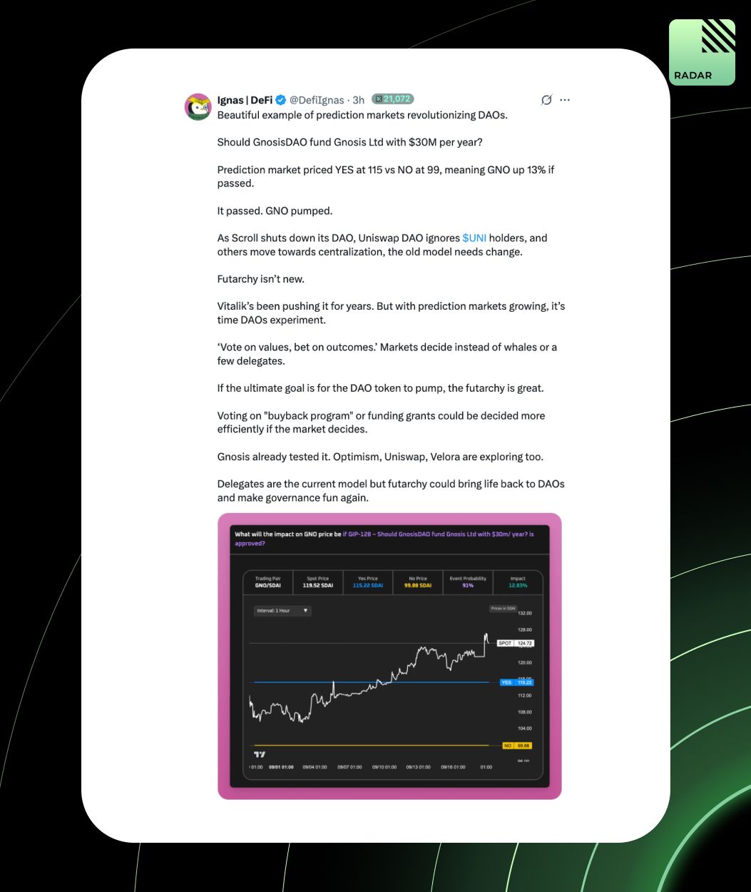 GnosisDAO just tested futarchy: a $30M/year funding vote priced via prediction markets. YES traded at 115 vs NO at 99, and after it passed, GNO pumped. With Scroll shutting down and Uniswap sidelining holders, futarchy offers a market-driven alternative to stale DAO governance.
