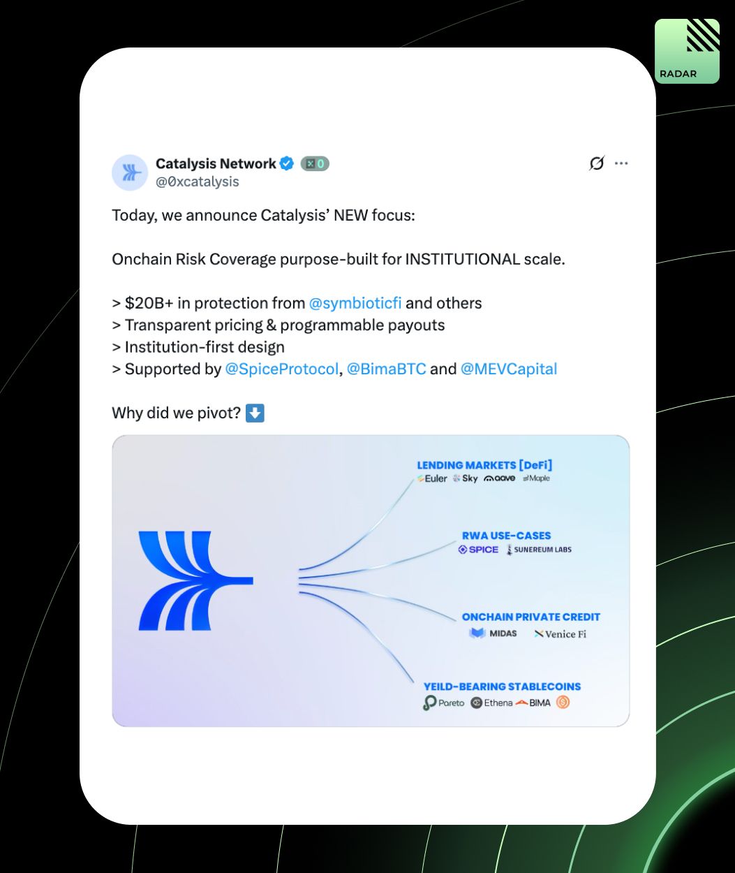 Catalysis pivots to institutional on-chain risk coverage, offering $20B+ in protection via restaked capital from Symbiotic and others. With transparent pricing, programmable payouts, and compliance-forward contracts, it targets lending, stablecoins, and yield products.