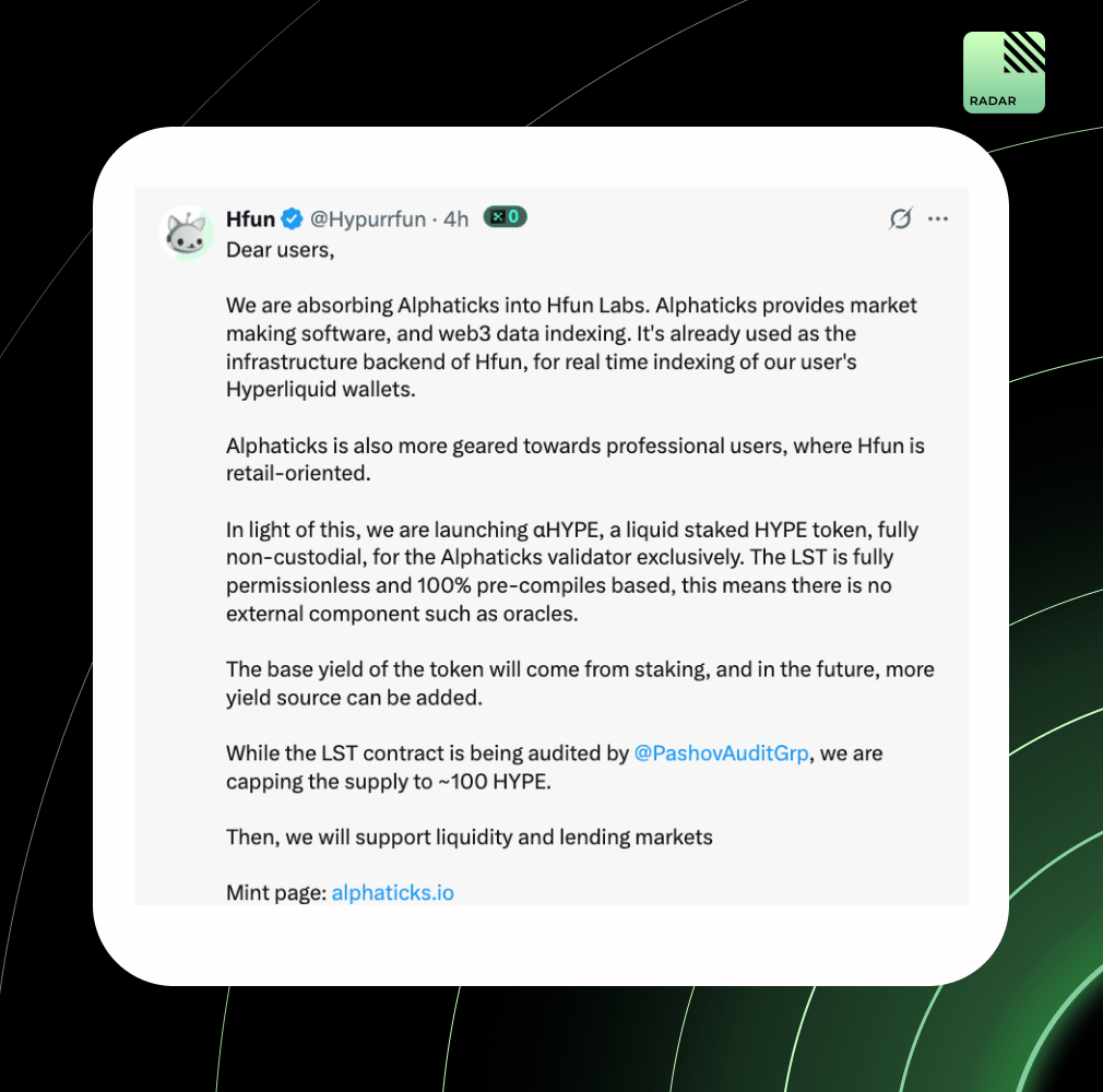 Hfun Labs is absorbing Alphaticks, the infra powering its Hyperliquid wallet indexing. To mark the move, it’s launching αHYPE, a non-custodial liquid staked HYPE token for the Alphaticks validator, capped at ~100 HYPE during audits, with staking yield and future liquidity support.