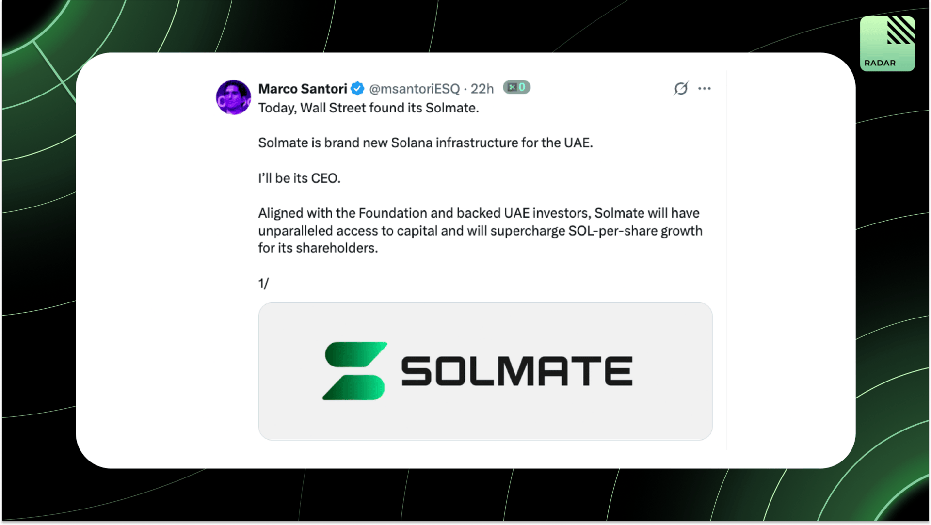Marco Santori unveiled Solmate, a UAE-based Solana infrastructure venture backed by Ark Invest, Pulsar Group, and RockawayX. Solmate will run staking ops in Abu Dhabi, blending treasury strategy with sports assets under Brera (BREA).