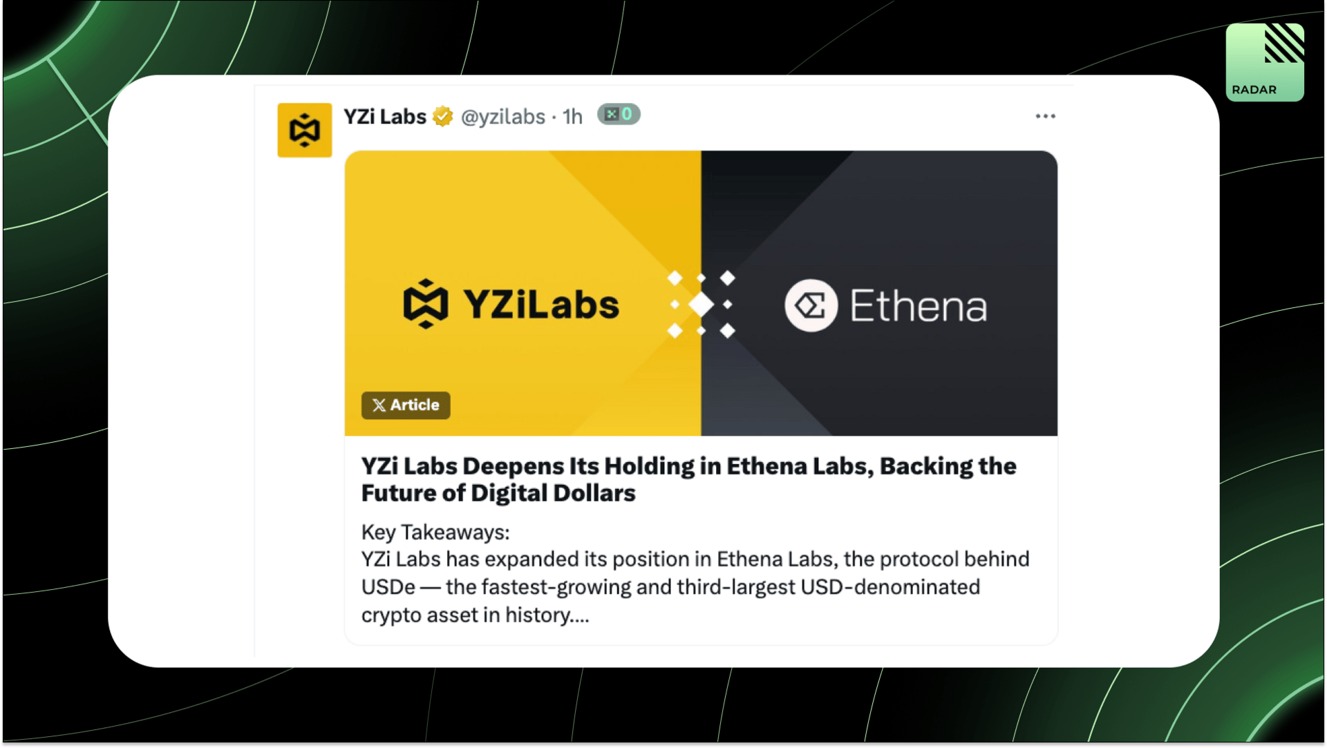 YZi Labs has deepened its stake in Ethena Labs, backing the $13B+ USDe ecosystem, the fastest USD asset to $10B. Support will drive USDe adoption, BNB Chain expansion, USDtb (fiat-backed stablecoin), and Converge, an institutional RWA settlement layer.