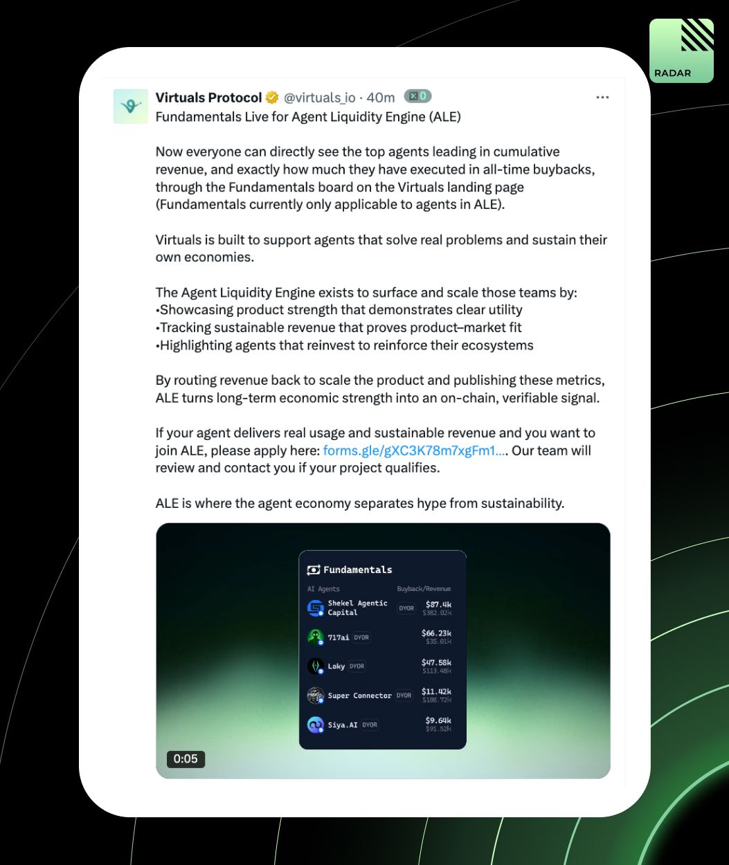 Virtuals just launched Fundamentals for its Agent Liquidity Engine (ALE), showing which agents are leading in revenue and buybacks. The ALE model routes revenue back into ecosystems, turning sustainable usage into on-chain signals of PMF. Fundamentals over hype.