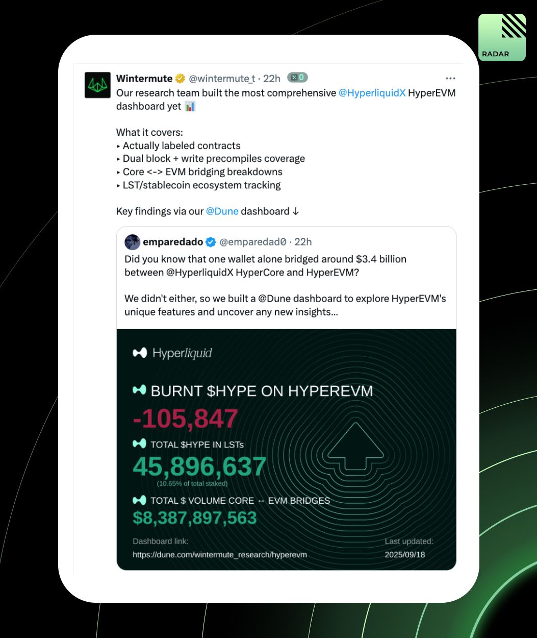 Wintermute has built the most detailed Hyperliquid’s HyperEVM dashboard yet, labeled contracts, precompile coverage, bridging flows, and LST/stablecoin tracking. One wallet alone moved $3.4B across HyperCore and HyperEVM.