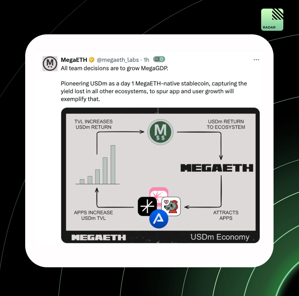 MegaETH’s strategy is to grow “MegaGDP” by making USDm the native yield-bearing stablecoin: returns from higher TVL flow back into the ecosystem, attract more apps, and those apps drive further USDm deposits, creating a self-reinforcing loop of growth and adoption.