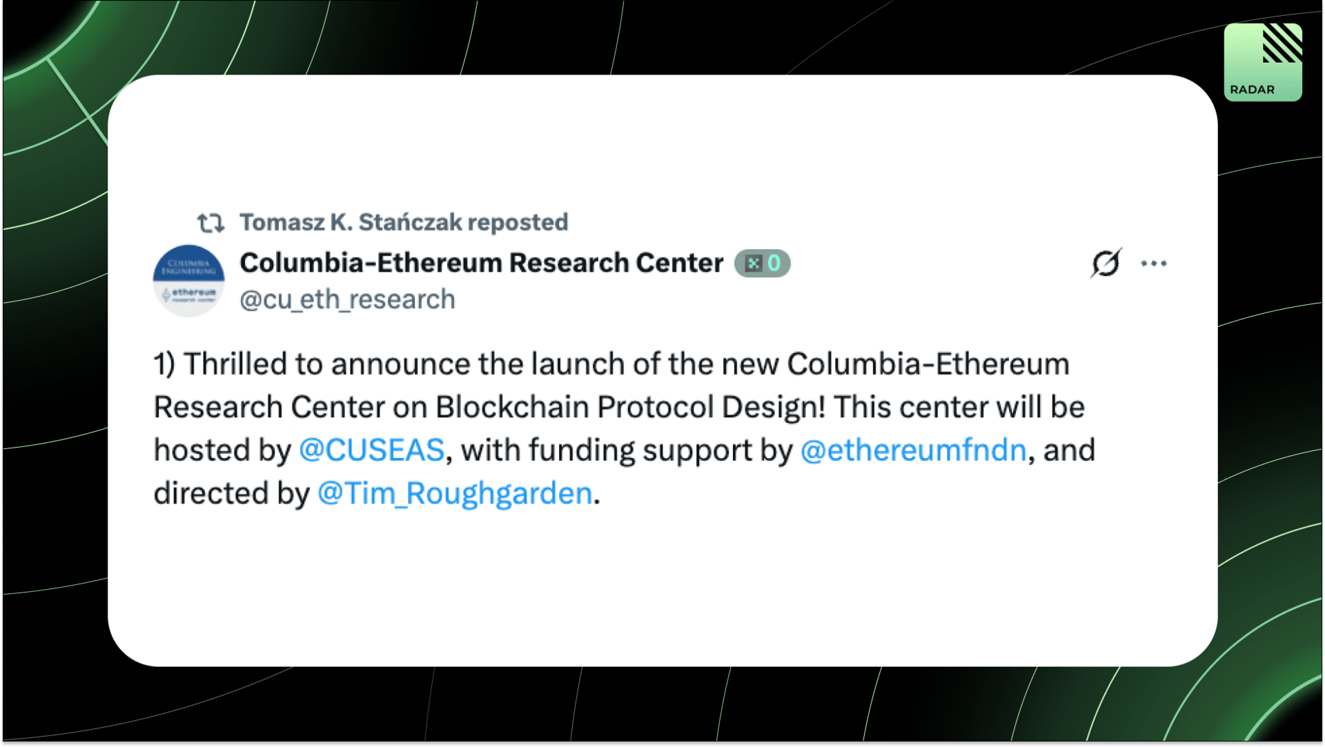 Columbia launched the Columbia-Ethereum Research Center, led by Tim Roughgarden, with EF backing. It’ll fund protocol research, postdocs, and events such as workshops and summer schools. Donations are matched up to $500K/year, and they’re hiring a Managing Director plus postdocs.