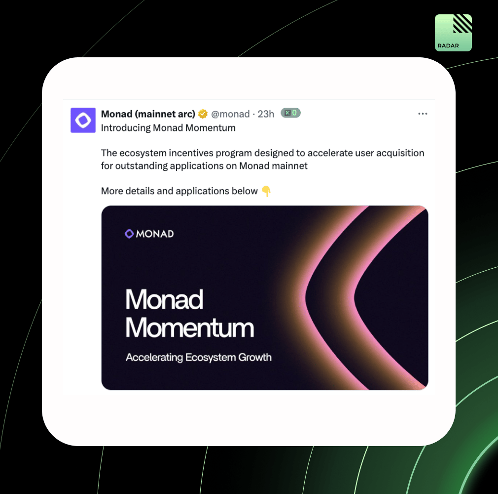 Monad launched Momentum, an incentive program to drive user growth for top apps on its mainnet. Wave 1 applications are now open and will close on September 28.