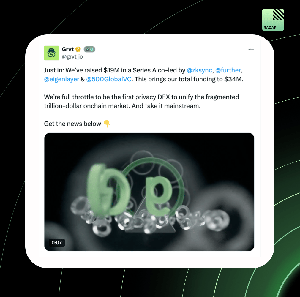 Grvt raised $19M Series A co-led by zkSync, Further, EigenLayer, and 500 Global, bringing total funding to $34M. Backed as a Hyperliquid challenger, it’s building a privacy-first DEX to solve “position hunting” and unify fragmented on-chain markets.