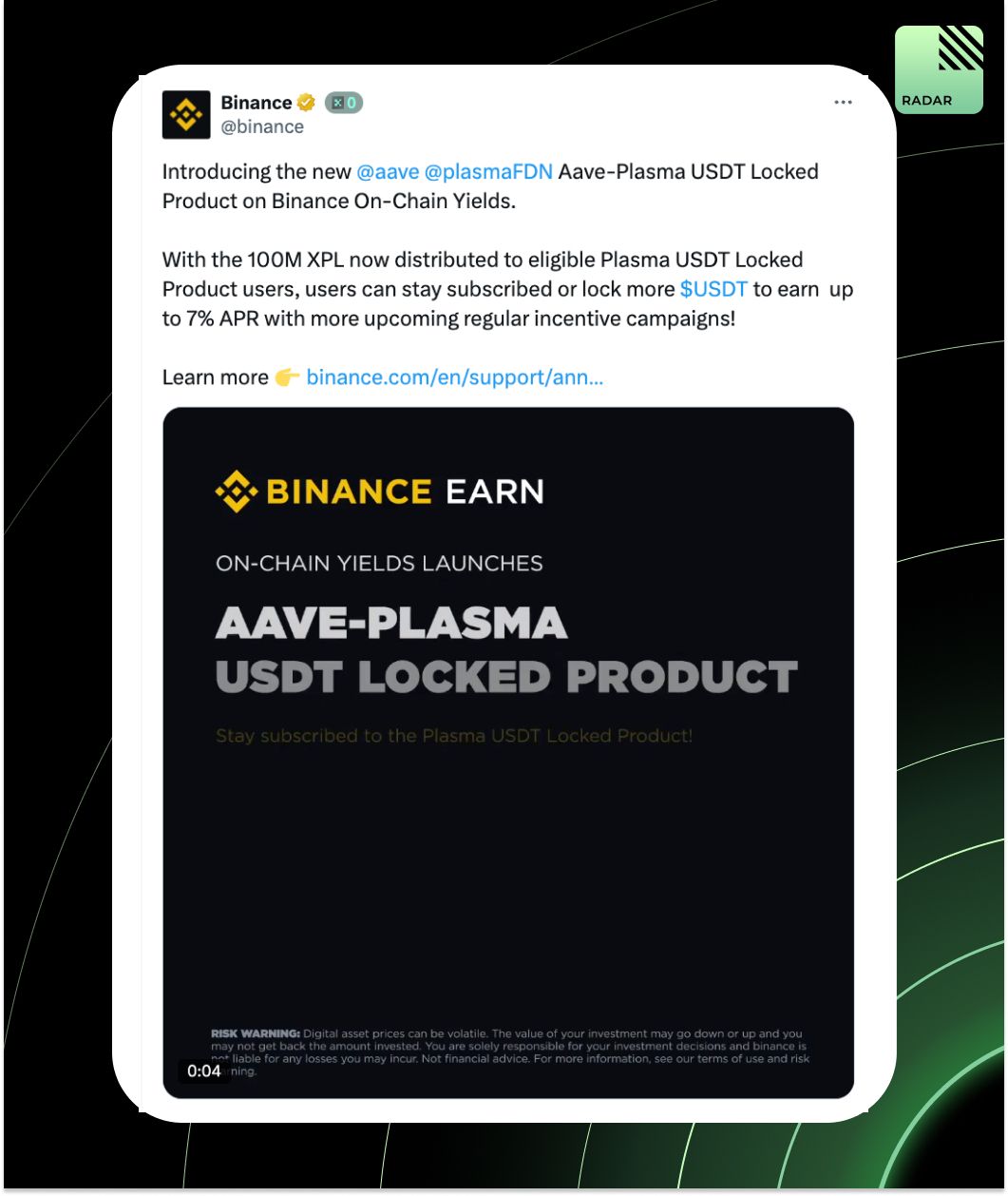 Binance upgraded its Plasma USDT product to the Aave-Plasma USDT Locked Product, offering up to 7% APR on-chain yields. Existing users are auto-subscribed to 60-day terms, while new users can join with flexible lockups from 15–90 days.