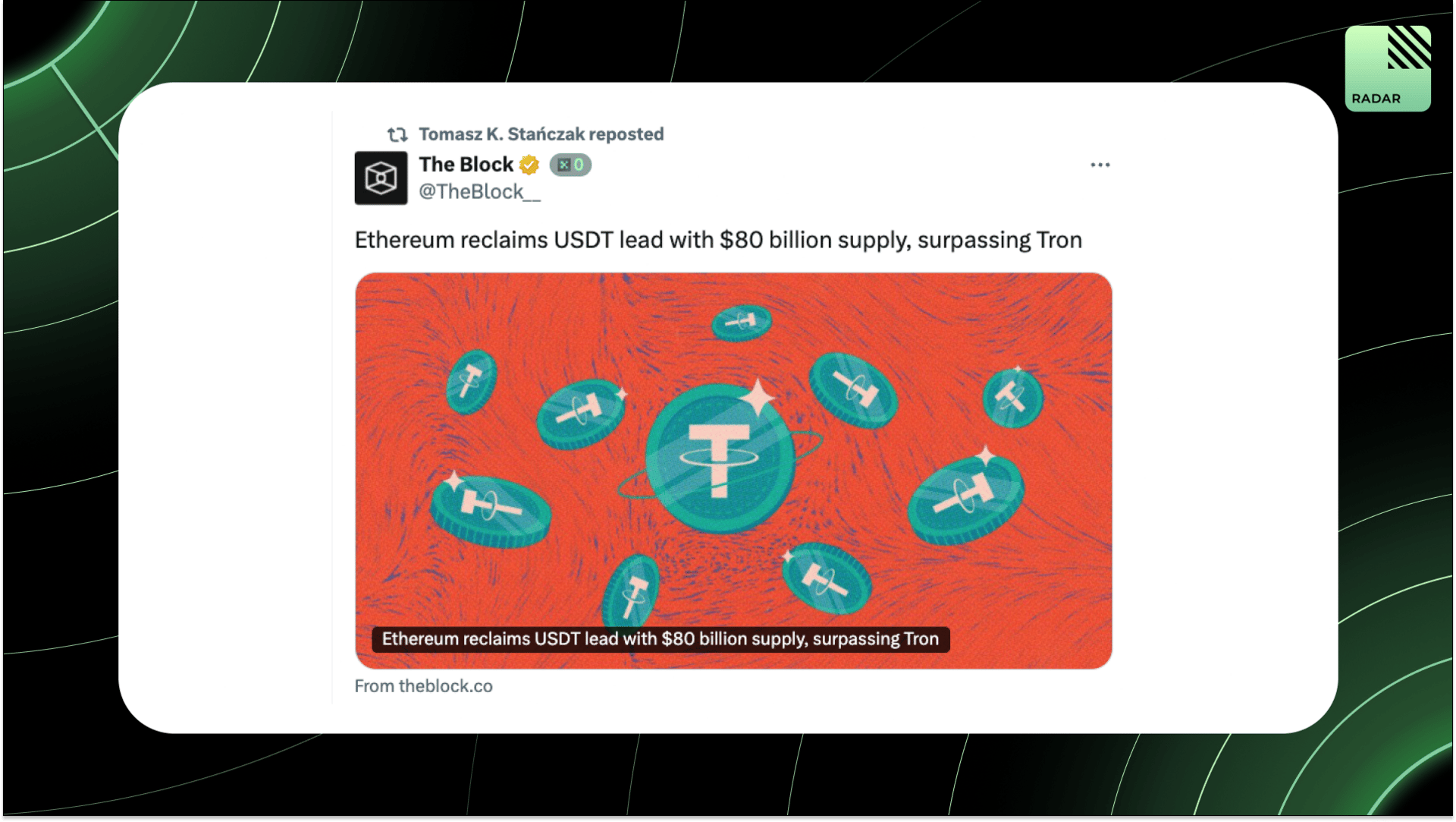 Ethereum has overtaken Tron in USDT supply with $80B, signaling a shift toward its DeFi depth and institutional rails. Daily transfers near 1M show active usage, reinforcing Ethereum as the preferred settlement layer for stablecoin adoption.