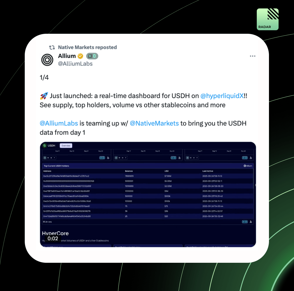 Hyperliquid’s new stablecoin USDH hit $24M supply within 9 hours, surpassing USDC’s share on HyperEVM. Backed by Native Markets, led by ex-Uniswap’s Lader, Max Fiege, and Anish Agnihotri, USDH is now HyperEVM’s 3rd largest stablecoin at 8.9%.