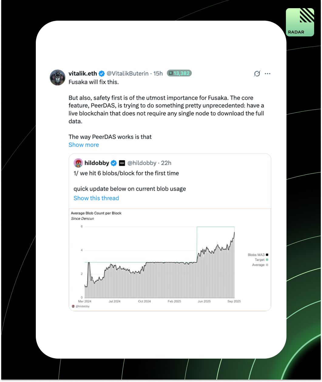 Vitalik explains Fusaka’s PeerDAS: nodes only sample small data chunks to probabilistically verify availability, using erasure coding for recovery. Early versions require one honest broadcaster, but future upgrades aim for full distribution, which is key to scaling Ethereum L2s and beyond.
