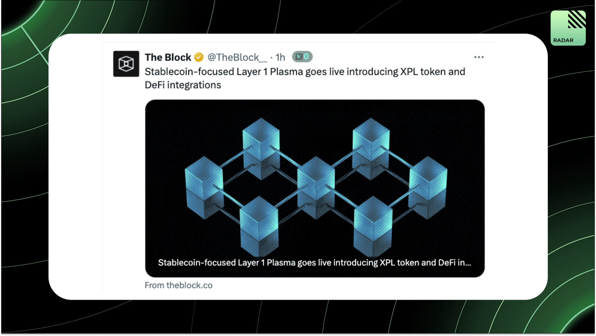 Plasma mainnet goes live with $2B stablecoin TVL, 100+ DeFi integrations, and zero-fee USDT transfers via PlasmaBFT. Its XPL token launched at an $8B FDV as the chain pushes a stablecoin-native neobank strategy with Plasma One.