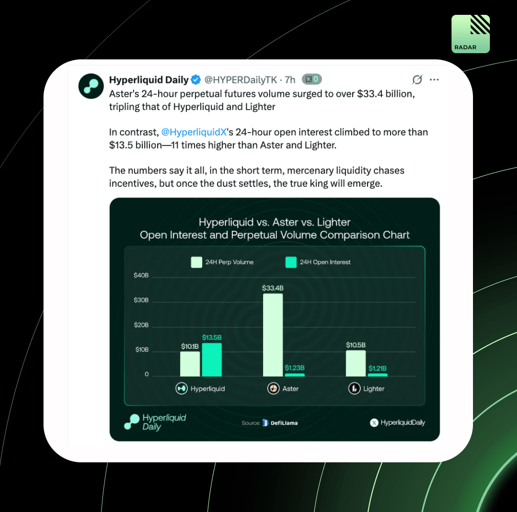 Aster hit $33.4B in daily perp volume, three times the volume of Hyperliquid and Lighter. However, Hyperliquid’s OI sits at $13.5B, 11 times that of its rivals. Incentives swing short-term flows, but depth will determine the real leader moving forward.