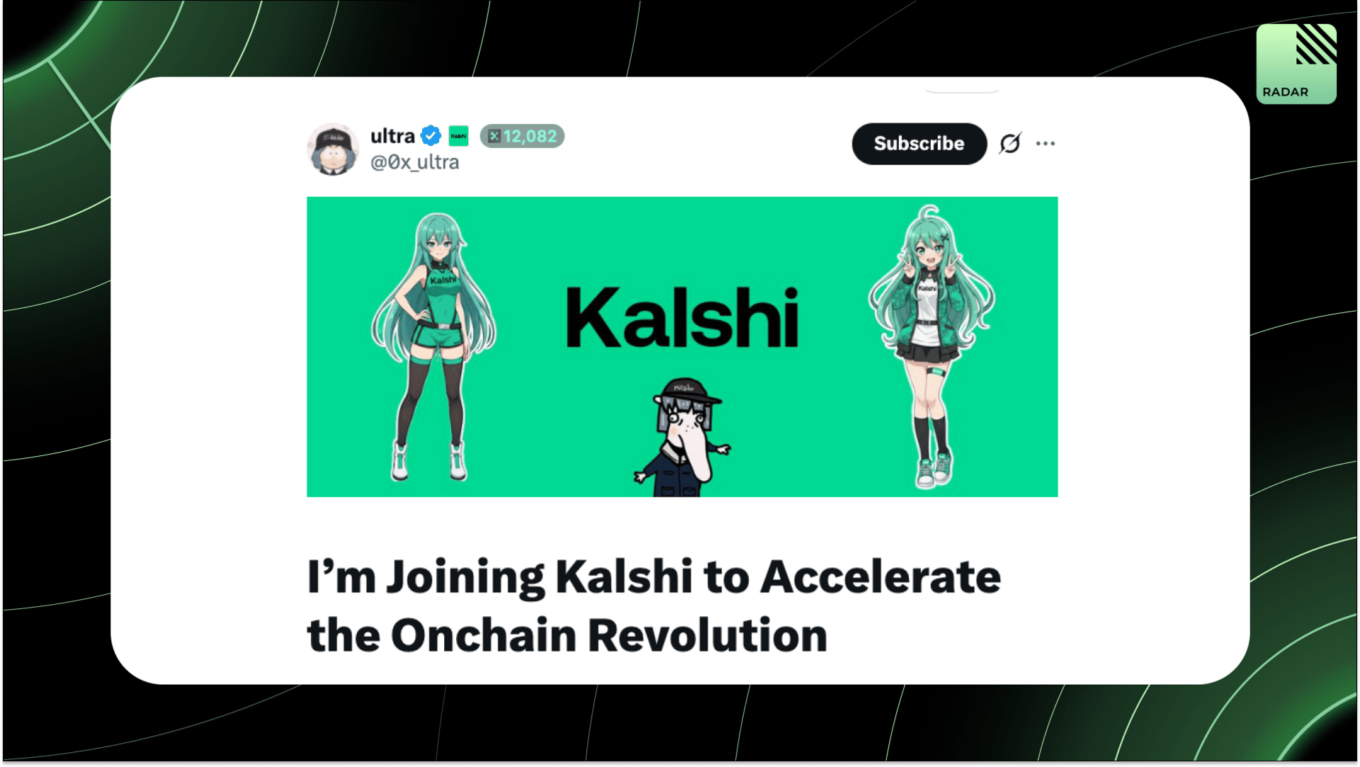 Ultra is joining Kalshi to scale prediction markets into the mainstream financial sector. He argues they’re a new asset class, praises Kalshi’s regulated model and ambition, and plans to expand social experiments while staying involved in MegaETH and Hunch.