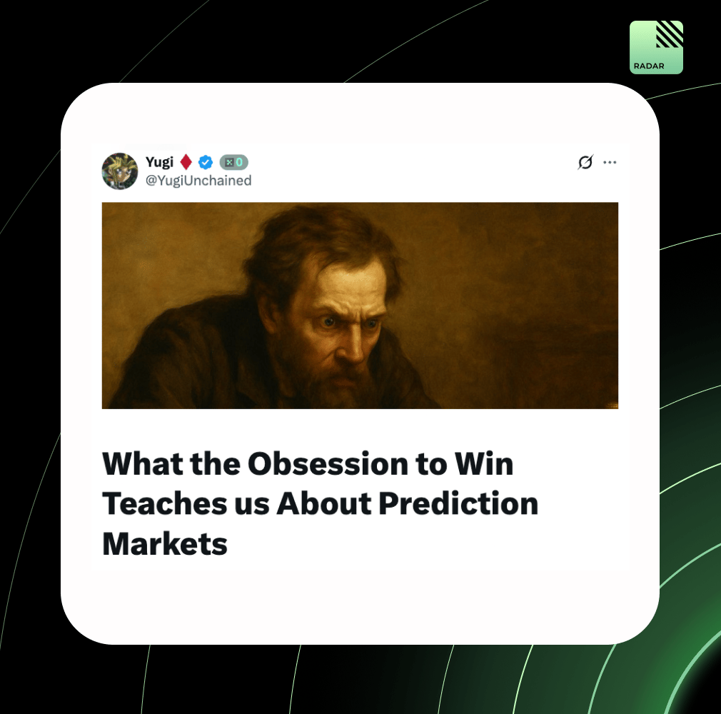 Prediction markets aren’t a passing CT meta; they’re an industry shaped by the obsession to win. Unlike the chaotic odds of memecoins, prediction markets offer binary conviction bets that tap into the same dopamine loop of being right, making them cycle-agnostic and here to stay.