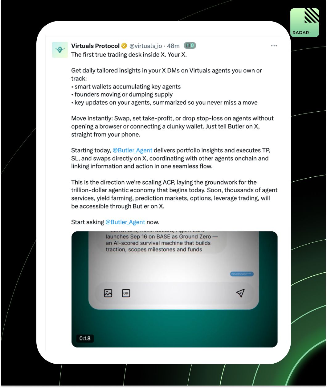 Virtuals launched Butler, a trading desk embedded in X. Users get agent insights in DMs and can set TP/SL or swap instantly without a browser. It links info and execution on-chain, scaling ACP toward a trillion-dollar agent economy. Didn’t Solana already do this?