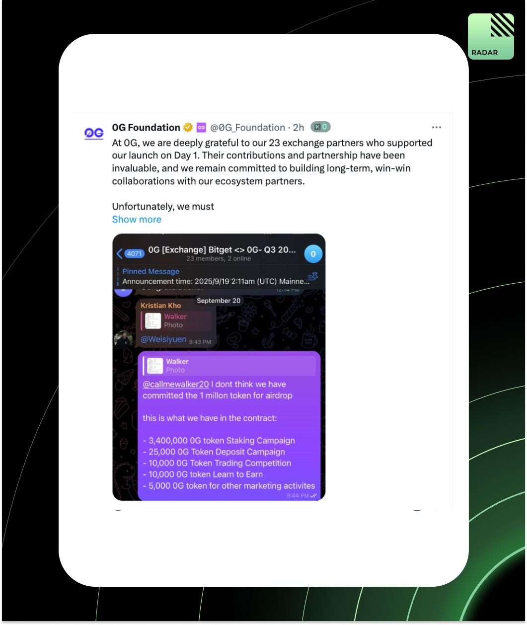 0G accused Bitget of breaking their agreement by replacing a 90-day staking campaign with an unauthorized 3-day Launchpool/airdrop. 0G has sent a legal demand, urged partners to halt deals with Bitget, and requested either token buybacks or financial compensation to rebuild trust.