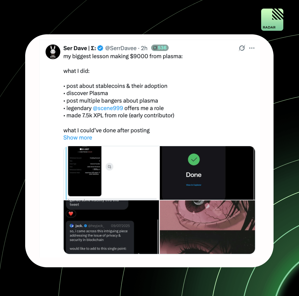 Ser Dave shares his Plasma journey: passion for stablecoins got him in early. He netted $9K, but realized a “game mindset” would’ve scaled his rewards. Now he’s applying that lesson to Makina, aiming for yield, points, and ICO access at a strong valuation.