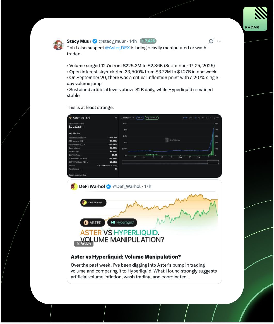 Stacy Muur flagged Aster’s explosive growth as likely wash trading: volume jumped 13 times to $2.86B, and OI 335 times to $1.27B, and fees outpaced revenue. Paired with whale transfers and a points system, the surge looks artificial compared to Hyperliquid’s stable metrics.