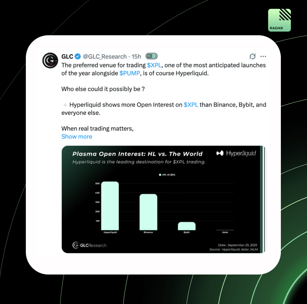 XPL launch showed Hyperliquid’s edge: more Open Interest than Binance, Bybit, and 250x Aster. Funding hit 500% APY, Liminal auto-built neutral plays, and traders piled in. More than a DEX, Hyperliquid is the ecosystem for major launches.