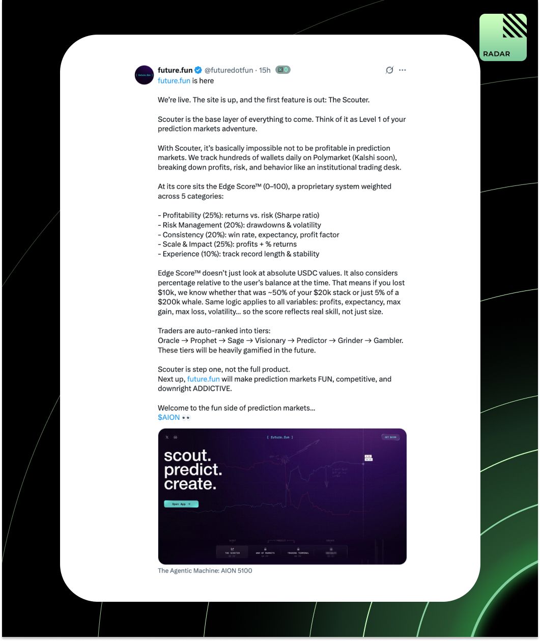 Futuredotfun is live with Scouter, tracking Polymarket wallets and ranking traders via an Edge Score across profit, risk, consistency, scale, and experience. Users get gamified tiers, making prediction markets competitive and addictive.